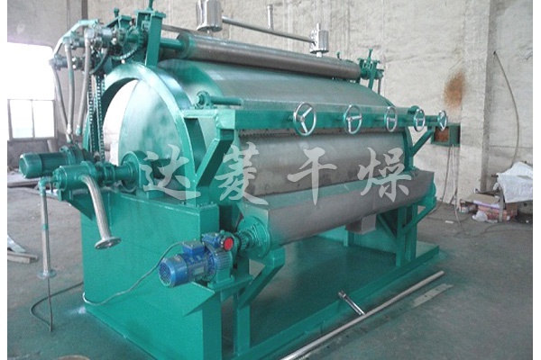 產品概述:滾筒刮板干燥機是一種內加熱傳導型轉動連續干燥設備。旋轉的滾筒通過其下部料槽,粘附著一厚度的料膜,熱量通過管道輸送至滾筒內壁,傳導到滾筒外壁,再傳導給料膜,使料膜中的濕度獲得蒸發、脫濕、使含濕分的物料獲得干燥。干燥好的物料被裝置在滾筒表面的刮刀鏟離滾筒,到置于刮刀下方的螺旋輸送器,通過螺旋輸送器將干物料集中、包裝。